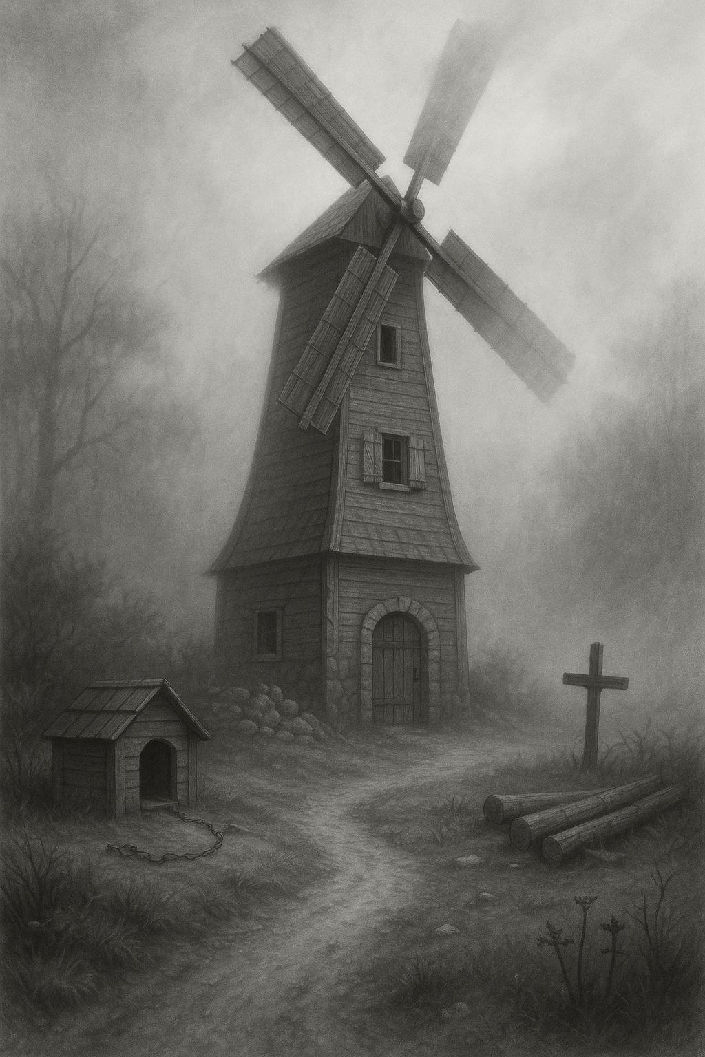 Stromy konečně ustoupily, mlha zřídla a cesta není tak strmá. Před vámi se z mlhy vynořil mlýn, štíhlý a vysoký - vrchní lopatka se ztrácí v mlze. Nejdřív jste viděli jenom obrysy, vysoké a hrozivé, ale pak se vynořil - je to krásná stavba. Je vidět, že je to nová budova, nedávno postavená. Dřevěné lopatky jsou sice vlhké, ale dřevo se zdá být natřené a ve velmi dobrém stavu. Stejně tak budova vypadá robustně. Pozemek je semtam zarostlý a neudržovaný. Na boku je hromada kamení a opodál několik kmenů smrků z nedávné stavby. Ještě kousek dál je v zemi zapíchnutý dřevěný kříž.