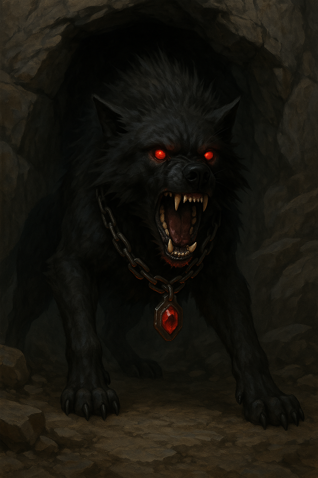 Když se přiblížíte k doupěti, ozve se hluboké vrčení - ale ne z temné pukliny před vámi. Vrčení přichází shora. Než stihnete zareagovat, obrovský černý pes skočí z převisu nad vámi. Je mnohem mohutnější než vlk, spíš velký jako býk, je celý černý, má zježené chlupy a rudě svítící oči. Z otevřené mordy plné ostrých zubů vychází hrozivé vrčení, z kterého se vám běhá mráz po zádech. Kolem krku má rudý, železný řetěz, který se mu vpaluje do kůže a na kterém visí kovová známka s rudým kamenem. Jak pes dopadl na zem, řetěz zachrastil.